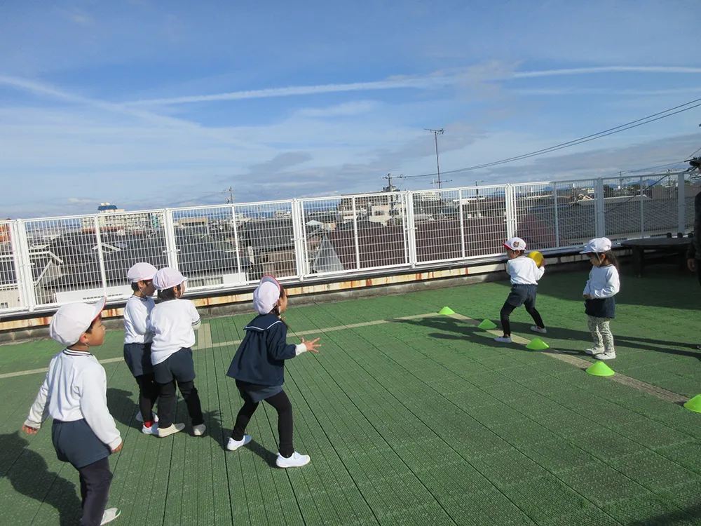 10:00〜園庭・芝生・屋上あそび、表現・造形・楽器・体育あそび等