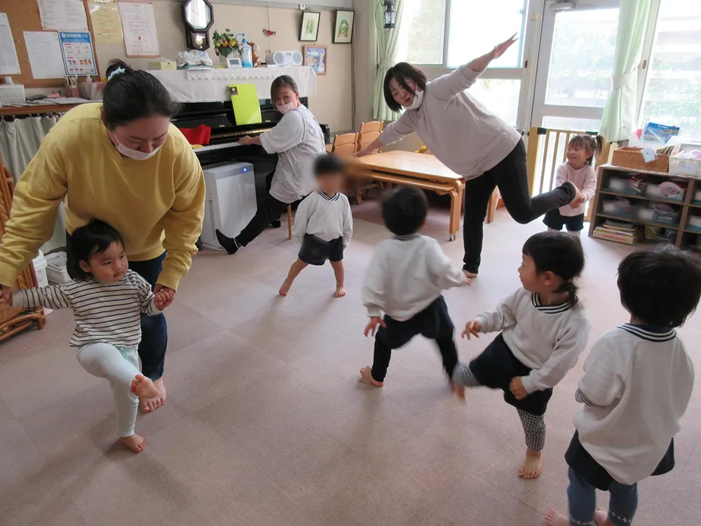 7:15~随時登園、体調チェック、検温(0歳児)、自由遊び、異年齢保育