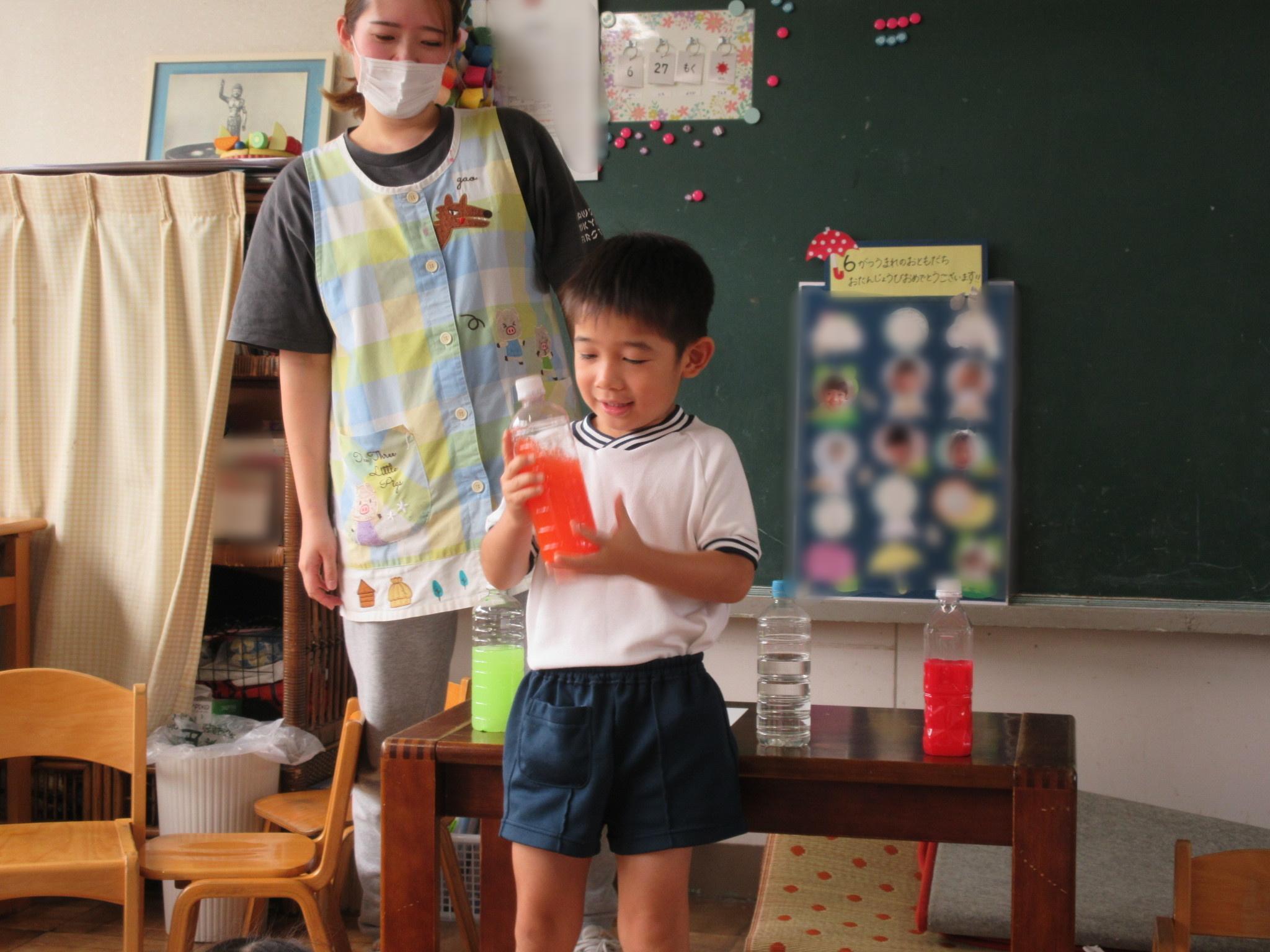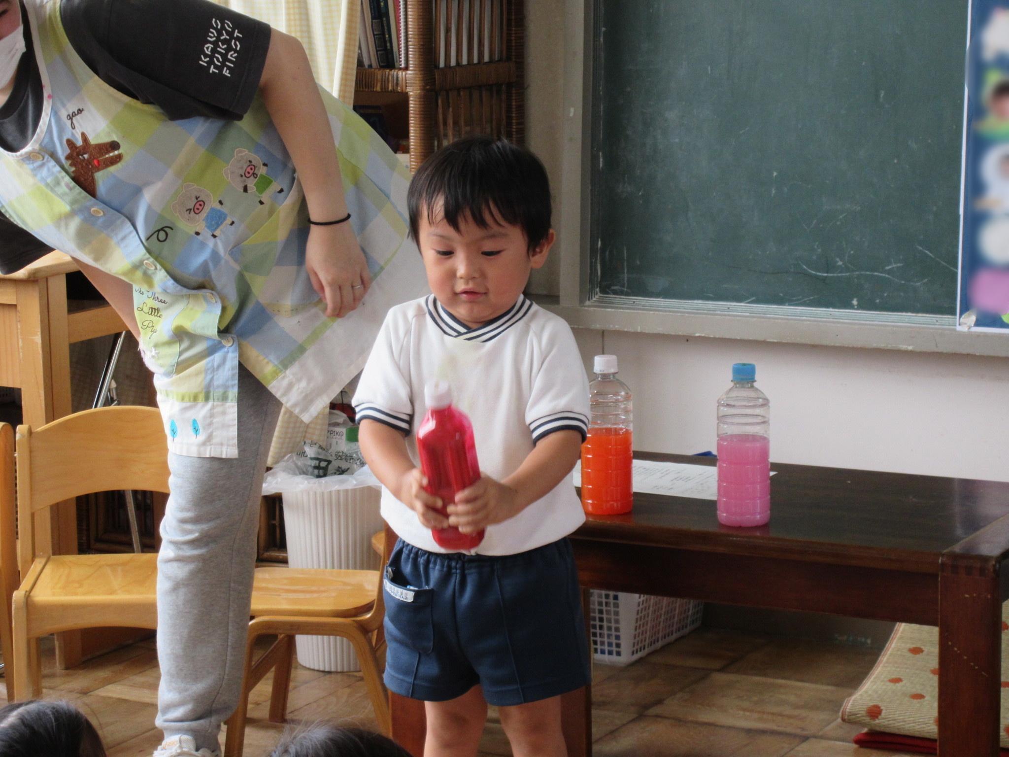 6月のお誕生会 24/06/27 6月生まれのお友達の誕生会を行いました。保育者からのプレゼントは、「色水マジック」の出し物でした。みんなで「ちちんぷいのぷい!」と魔法の言葉をかけ、代表して誕生児がペットボトルを振ると、透明な水がジュースに大変身‼マジックに驚く子どもたちでした。