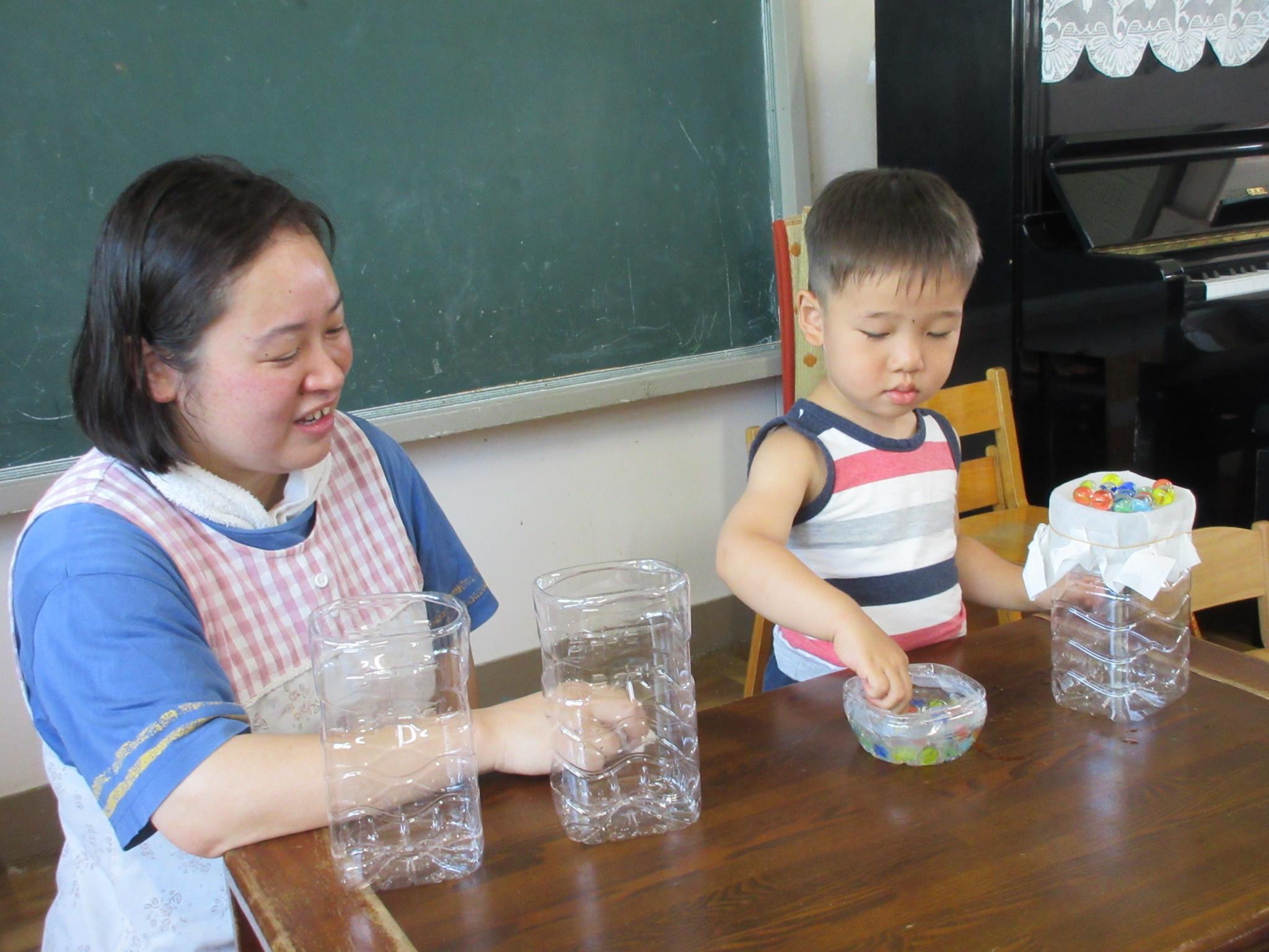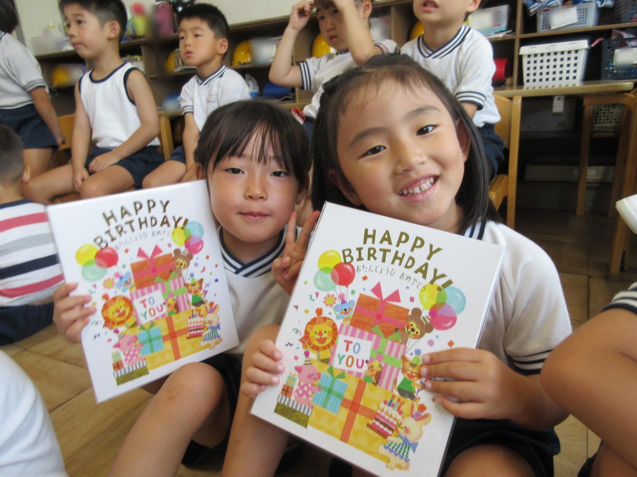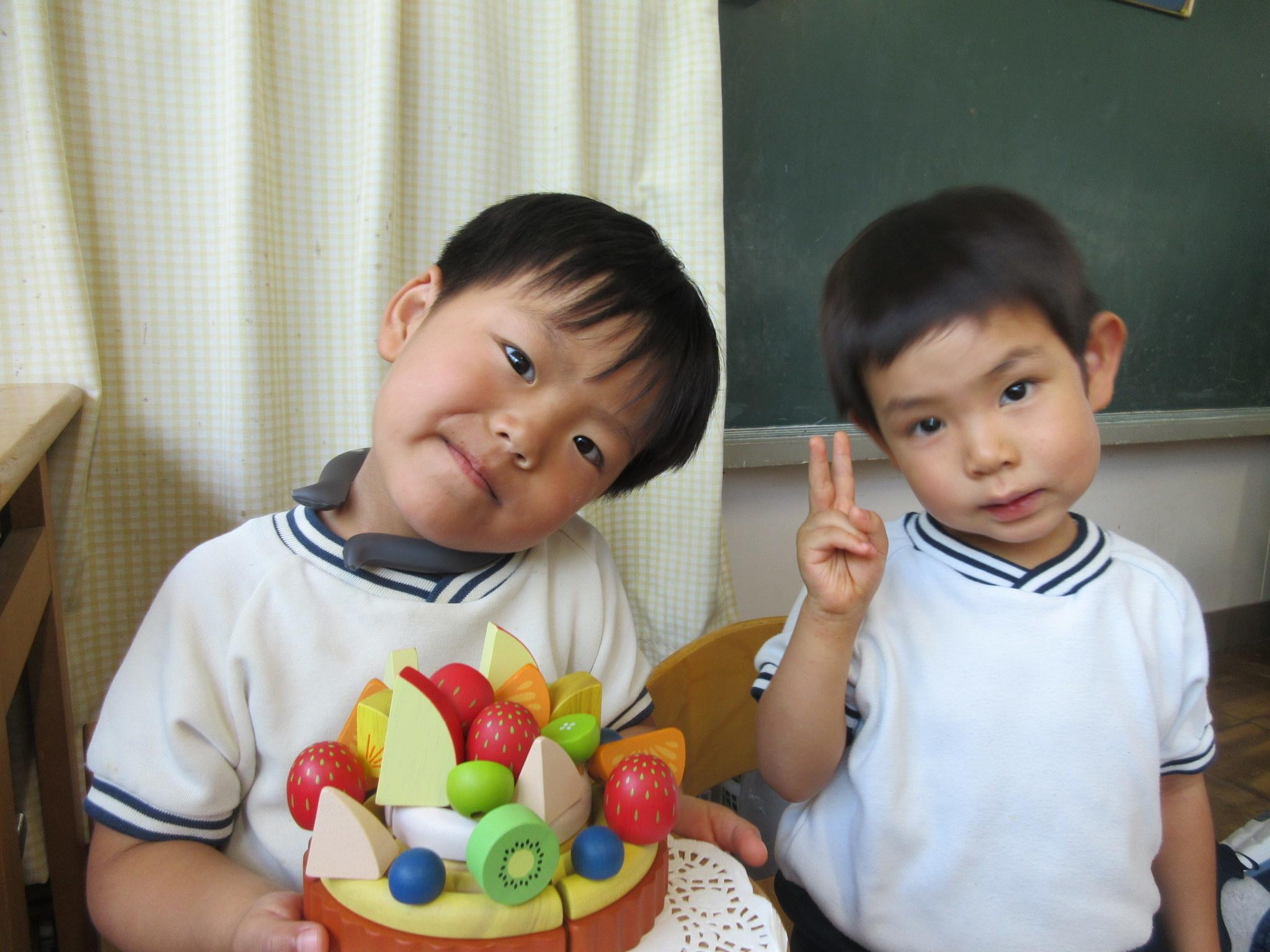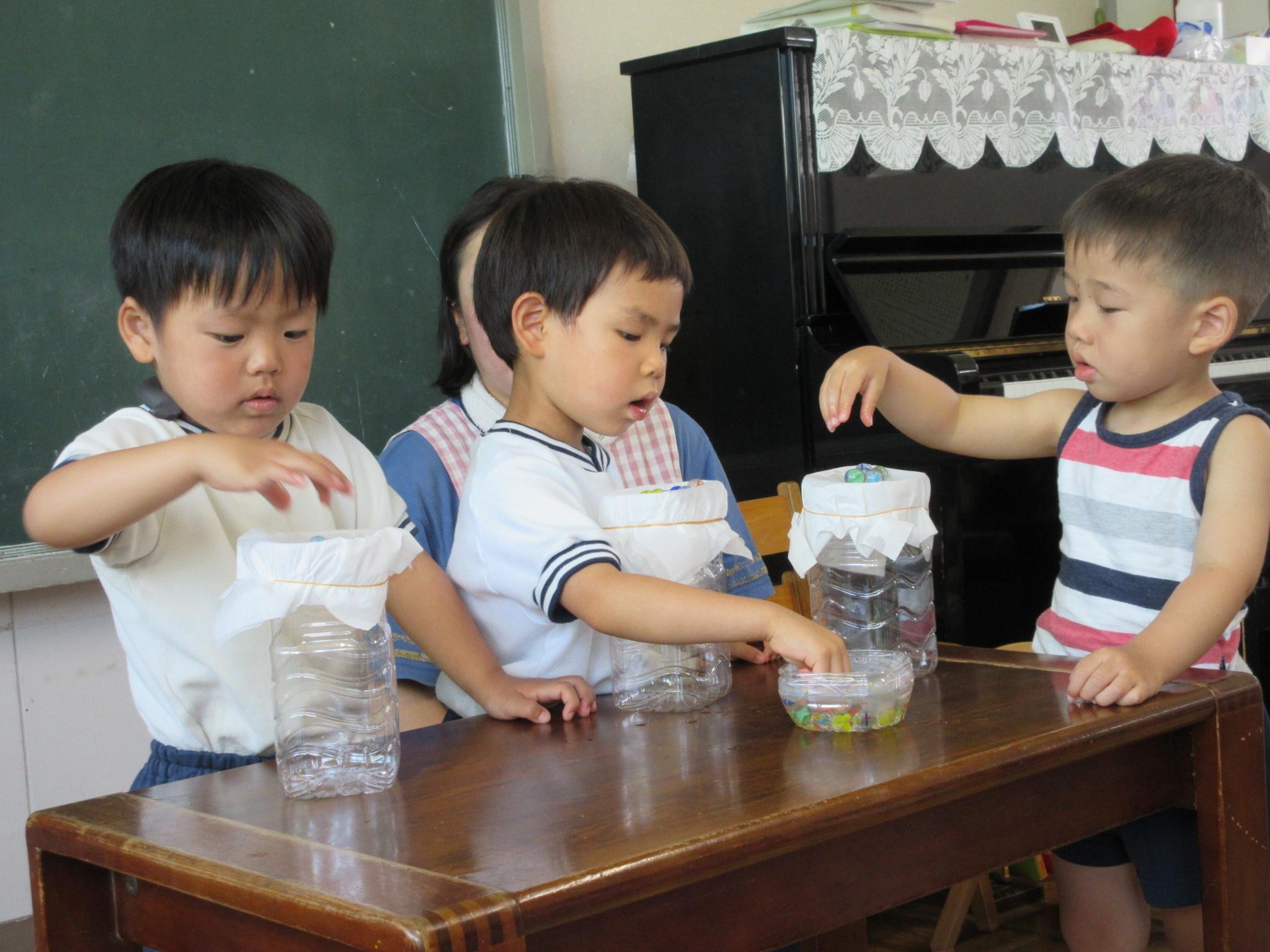 7月誕生会 24/07/31 7月生まれのお友達をみんなでお祝いしました。先生からのお楽しみは”ビー玉乗せゲーム”でした。ティッシュペーパーで蓋をしたペットボトルの上に水に浸したビー玉を乗せていく遊びで、誕生児が挑戦しました。「何個で落ちるかな?」とみんなでドキドキしながら見守っていたところ、20個近くまで乗せることができました。みんな上手でした‼