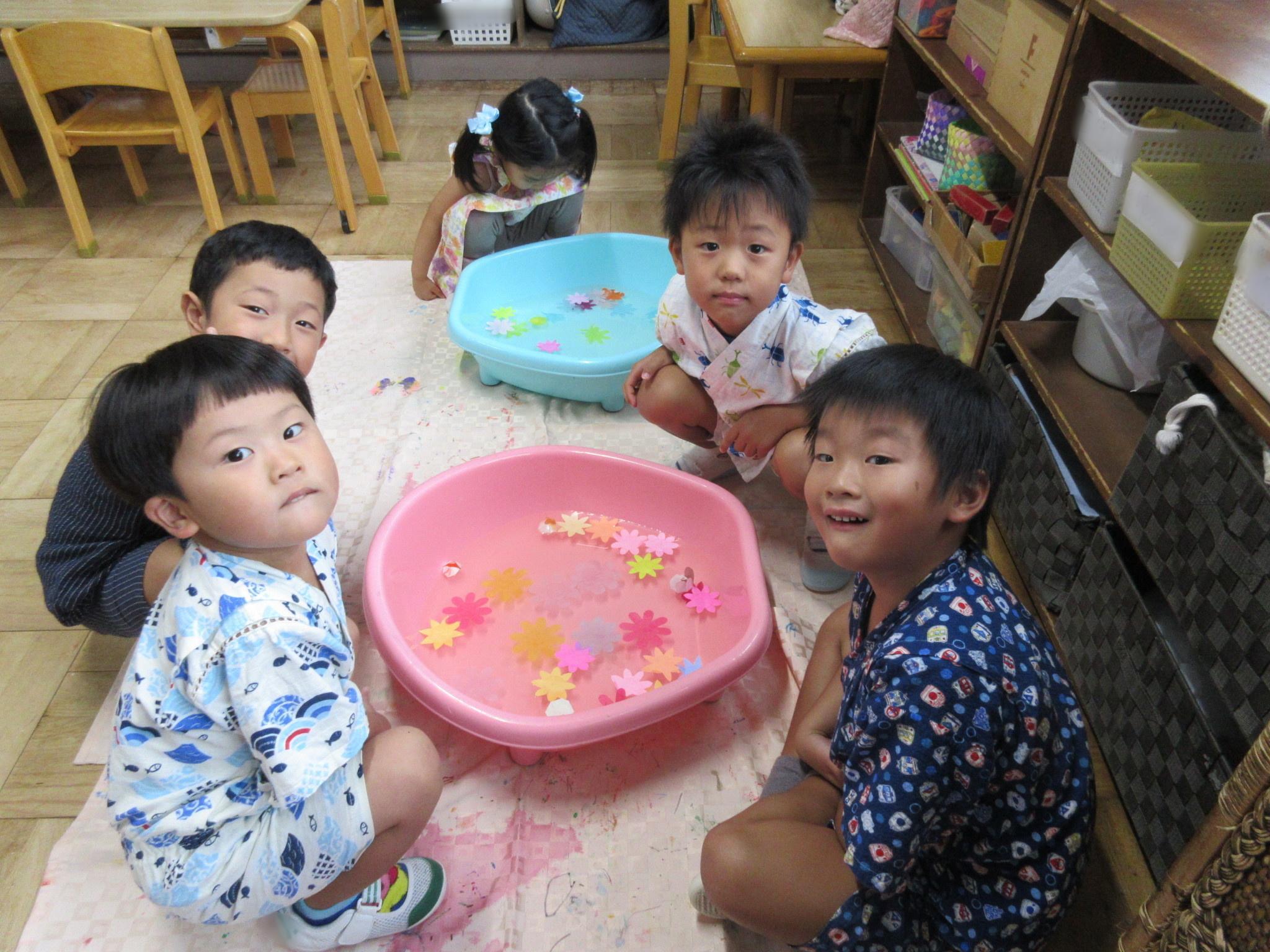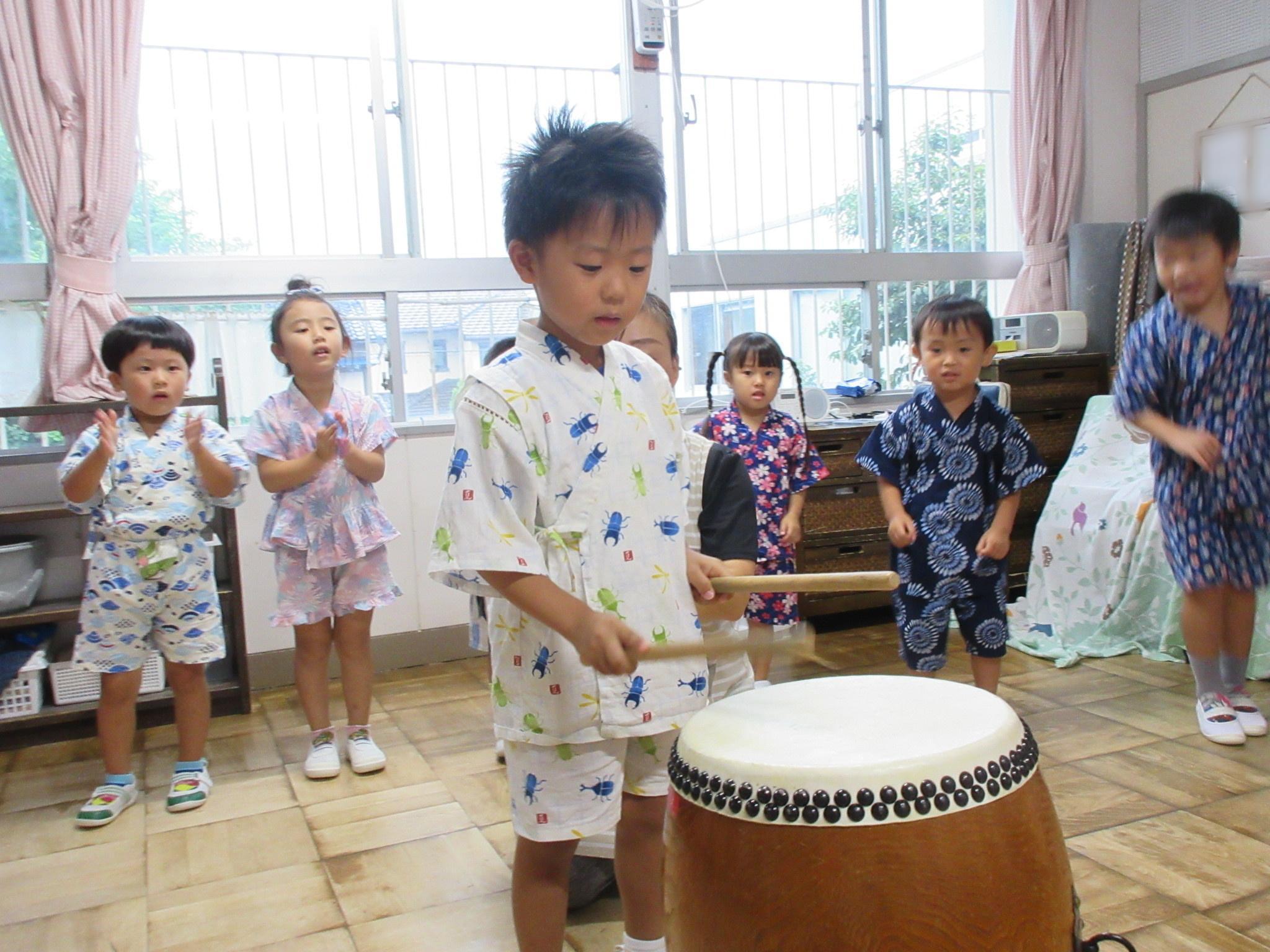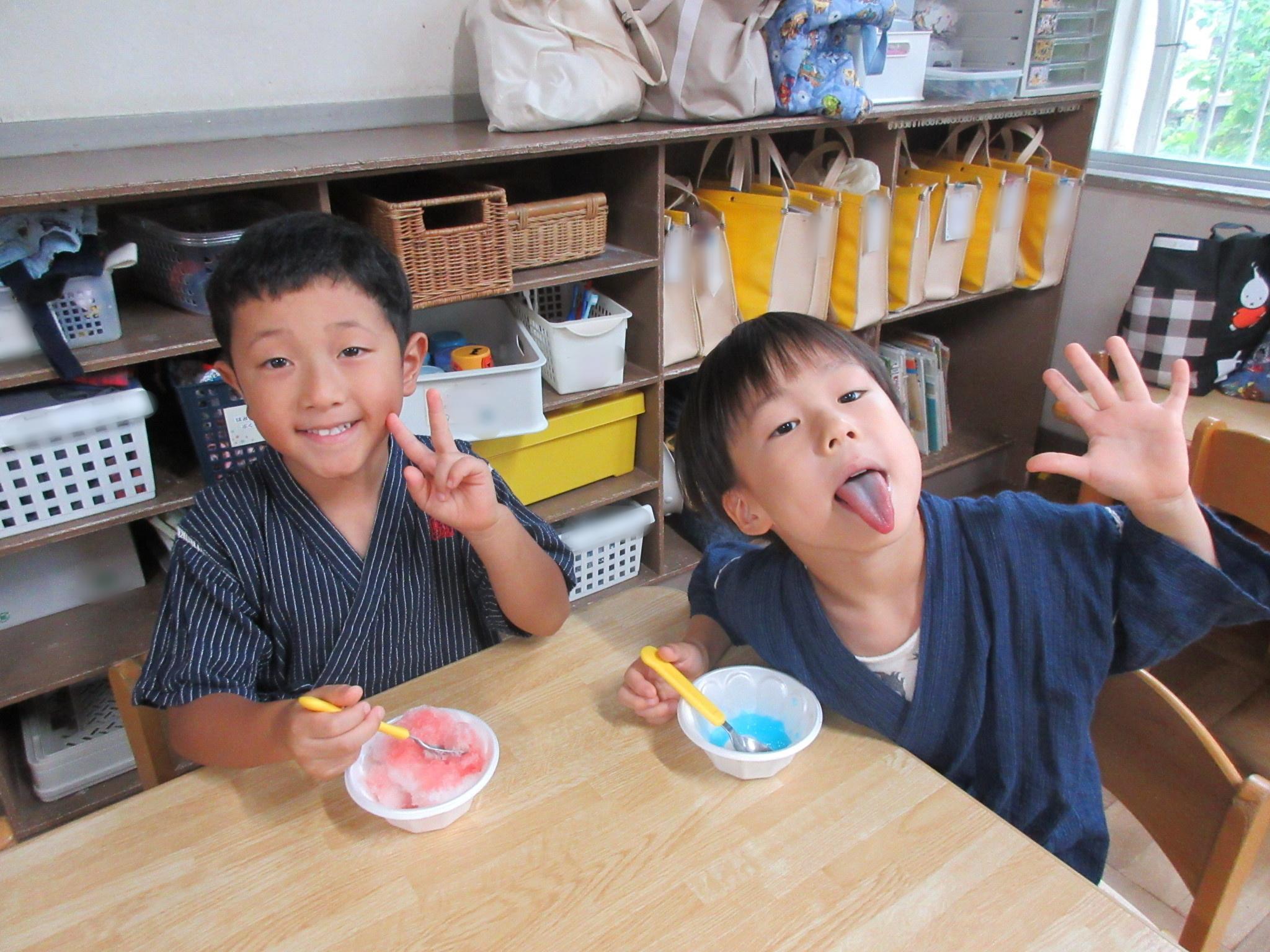 夏まつりごっこ 24/08/28 盆踊り、楽しいね。 ドドンがドン、和太鼓に挑戦したよ。 お水の中で、お花が咲いたよ。とてもきれいだったよ。 カブト虫コーナーでカブト虫触ったよ。 かき氷、美味しいね。先生、見て。舌ベロが青いよ。