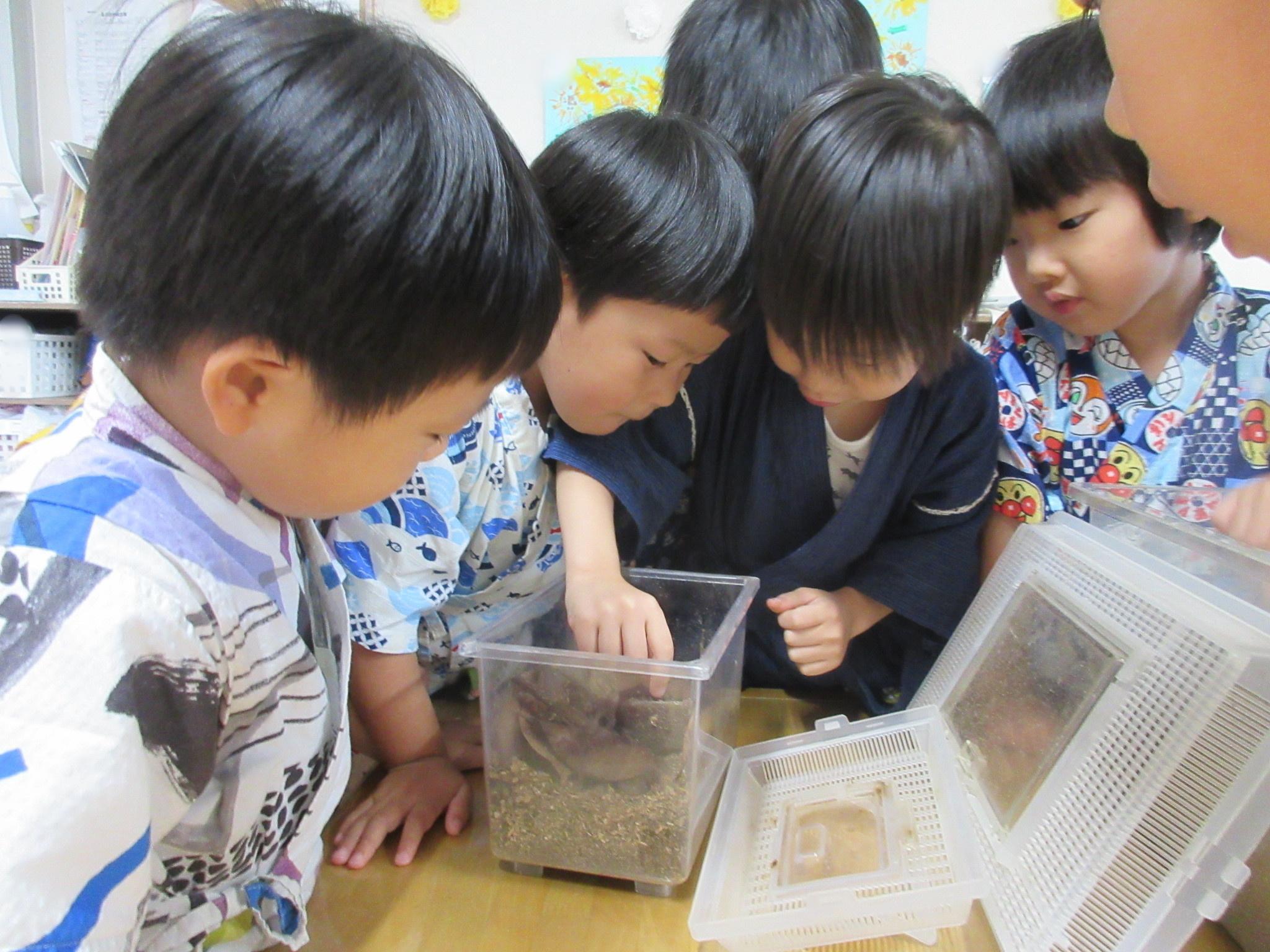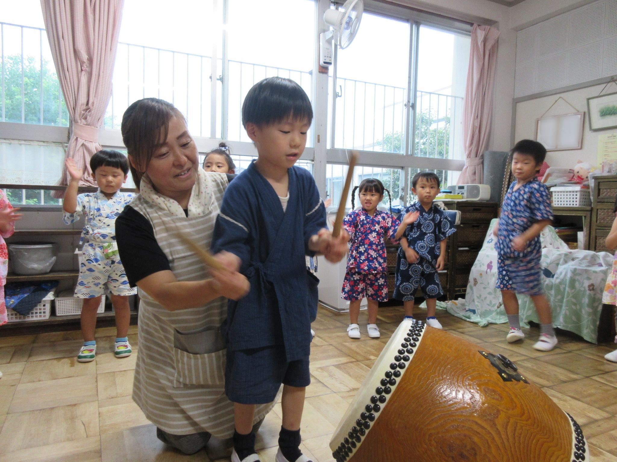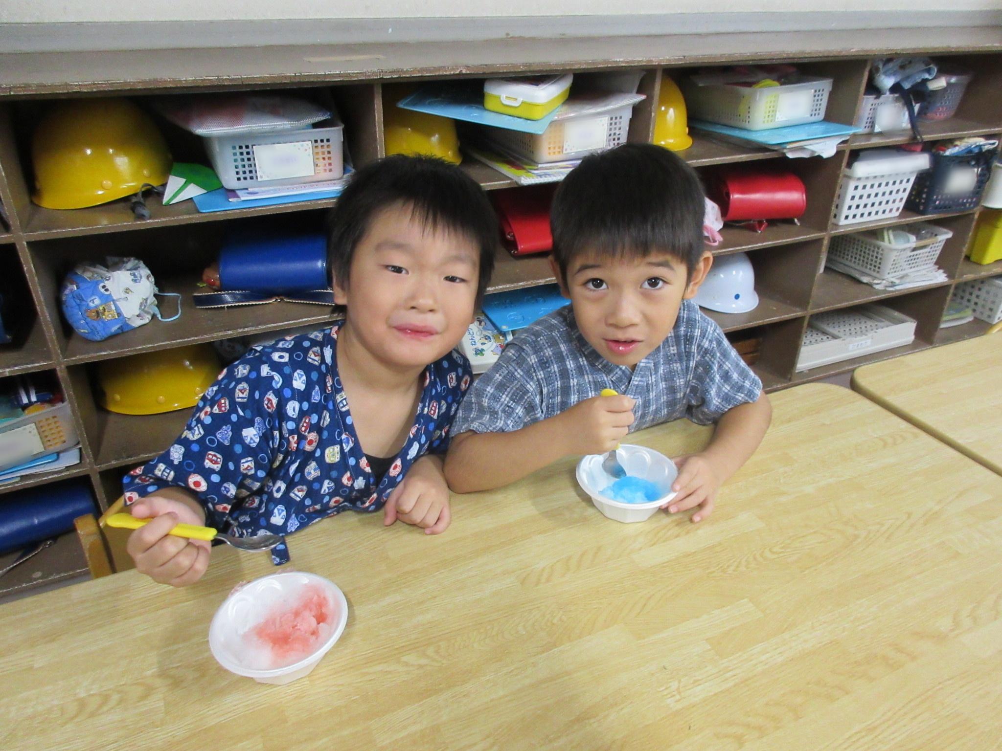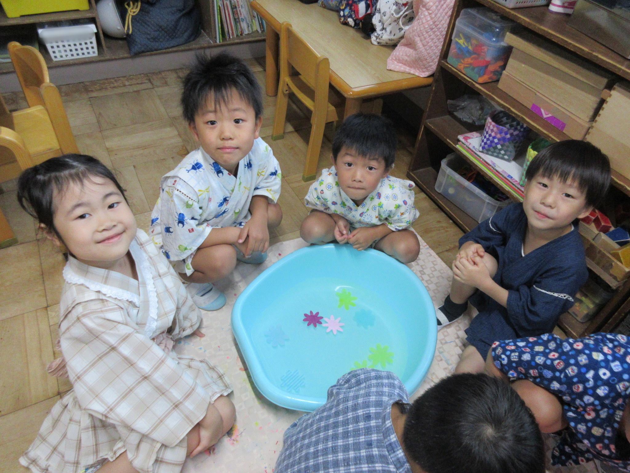 夏まつりごっこ 24/08/28 盆踊り、楽しいね。 ドドンがドン、和太鼓に挑戦したよ。 お水の中で、お花が咲いたよ。とてもきれいだったよ。 カブト虫コーナーでカブト虫触ったよ。 かき氷、美味しいね。先生、見て。舌ベロが青いよ。