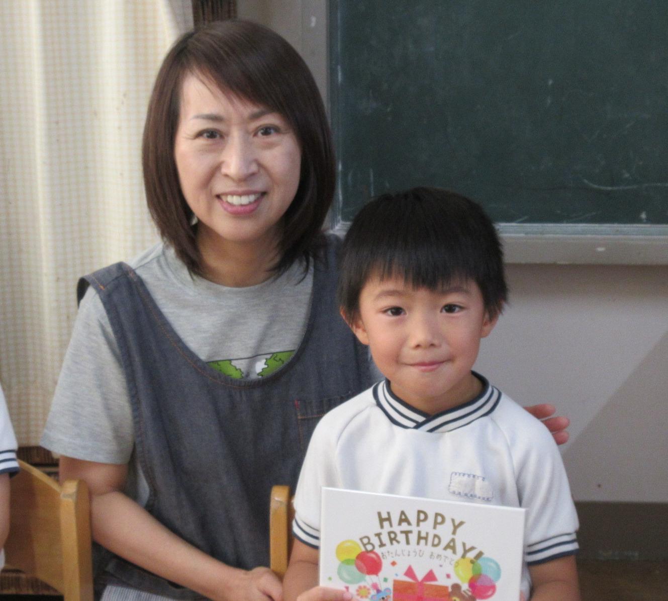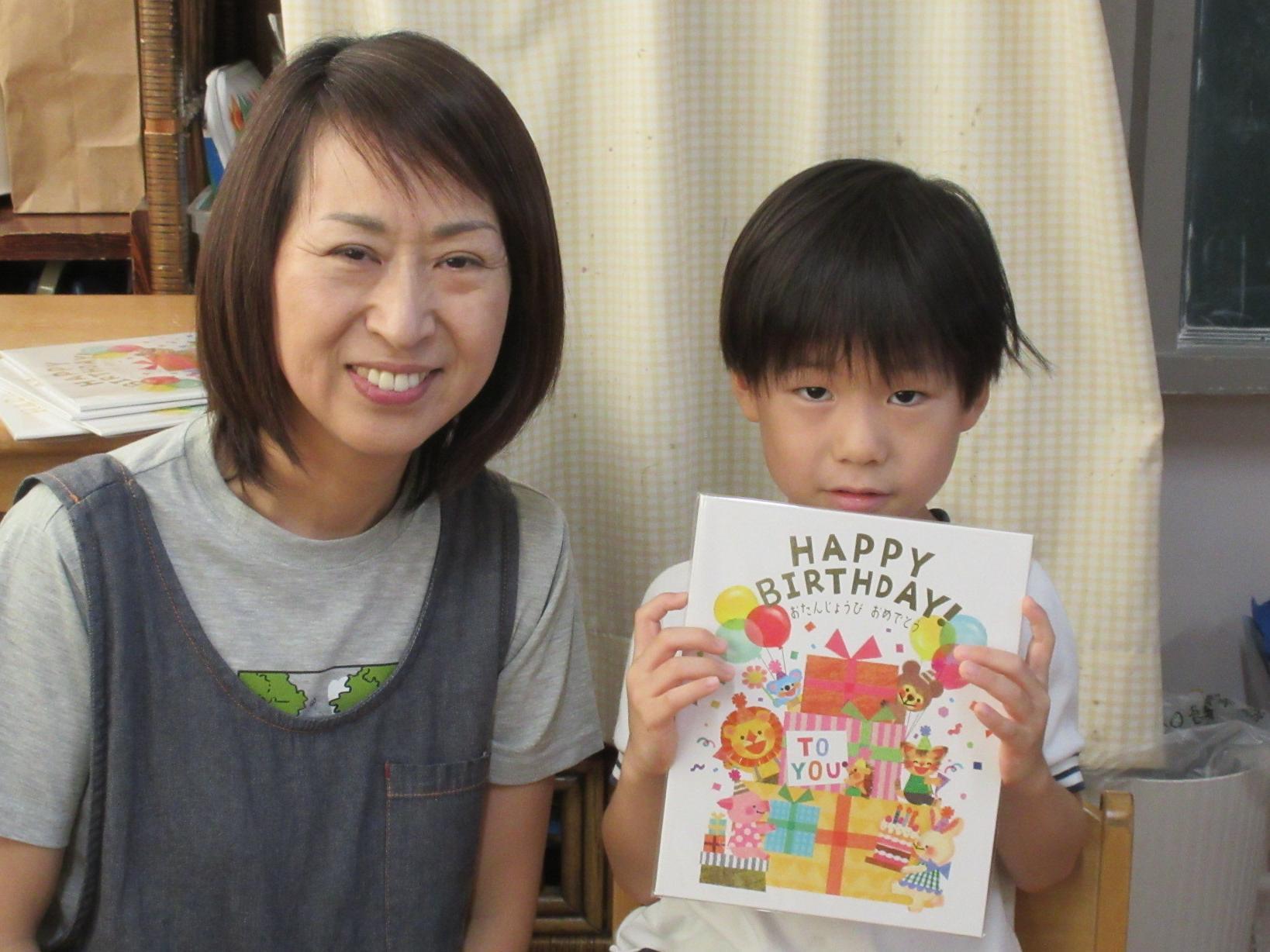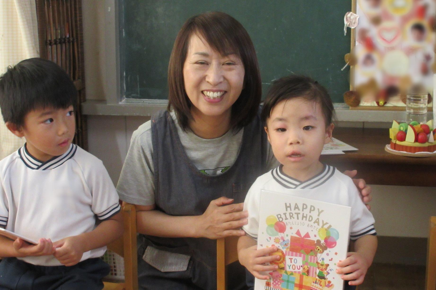 9月誕生会 24/09/25 9月の誕生会をしました。みんなから♪ハッピーバースデーの歌などでお祝いしてもらい嬉しそうでした。保育者からの出し物「何が隠れているかな?」では、水を注ぐと隠れていたキャラクターが出てくるマジックでした。代表で誕生児に水を注いでもらいました。キャラクターが出てくると、元気に答え、大盛り上がりでした。